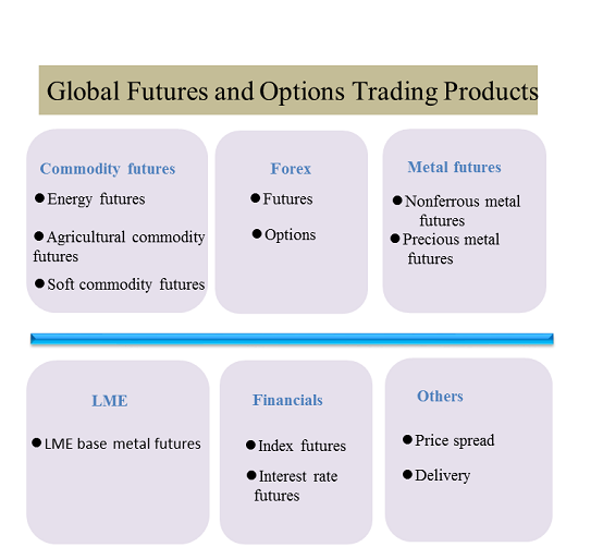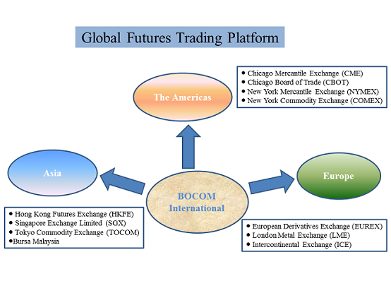 Our trading platform is connected to major futures exchanges in the Americas, Europe and Asia (such as CME, LME, SGX), covering futures and options contracts in commodities, metals, energy, stock indices, forex and agricultural commodities.