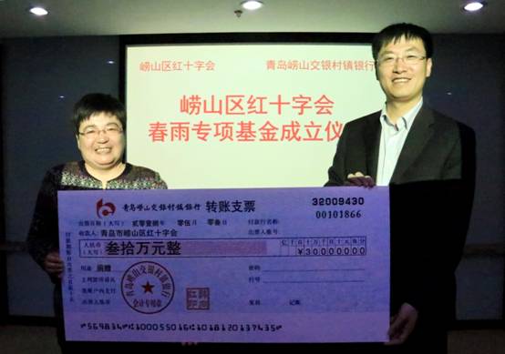 为深入贯彻十九大精准扶贫精神,落实崂山区委区政府关于加强大病困难群众救助的部署要求,5月3日,在五八世界红十字日来临之际,我行与崂山区红十字会共同发起的“崂山春雨专项基金”成立仪式在崂山区政府举行。
