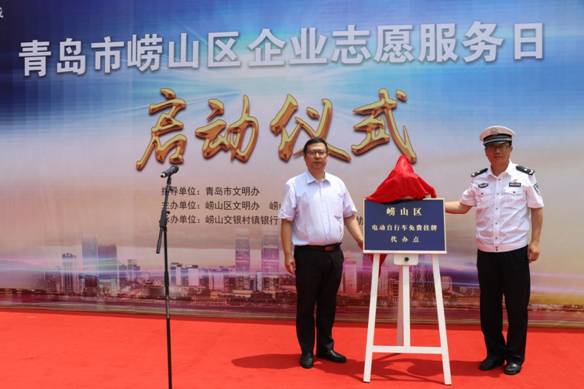 启动仪式上,青岛市文明办和崂山区委宣传部相关负责同志分别向村镇银行5个支行志愿者服务团队授旗,并颁发“志愿服务日”认证证书。同时,崂山交警大队与崂山交银村镇银行共同为电动自行车挂牌代办点揭牌,标志着青岛市第一家由金融企业组织的交通便民延伸服务代办点正式成立。