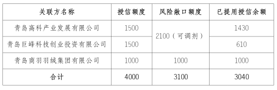 报告期末,股东关联授信(详情见下表)额度4000万元,敞口3100万元,系青岛巨峰科技创业投资有限公司、山东亚太中慧集团有限公司股东关联授信。