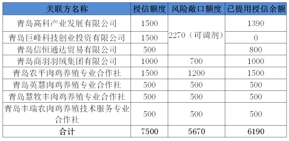 报告期末,股东关联授信(详情见下表)额度7500万元,敞口5670万元,系青岛巨峰科技创业投资有限公司、山东亚太中慧集团有限公司股东关联授信。