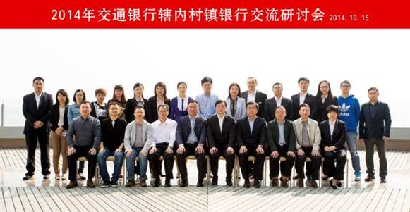 2014年10月15日, 2014年交通银行辖内村镇银行交流研讨会由我行承办召开。总行投资管理部总经理助理赵海慧、总行总行投资管理部整合管理部高级经理邱文倩、青岛银监局农金处副处长张大卫、青岛分行预算财务部总经理于茂兴、四家交银村镇银行行长及所在地监管部门领导也参加了本次交流研讨会。