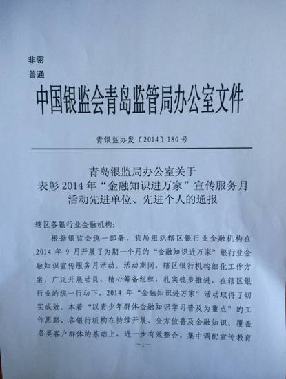 2014年9月,青岛银监局组织辖区银行业金融机构开展了为期一个月的“金融知识进万家”银行业金融知识宣传服务月活动。活动结束后,经青岛银监局综合考评,我行被授予“2014年度青岛银行业金融知识进万家活动先进单位”荣誉称号,我行业务发展部马睿、林森被授予“2014年度青岛银行业金融知识进万家活动先进个人”荣誉称号。
