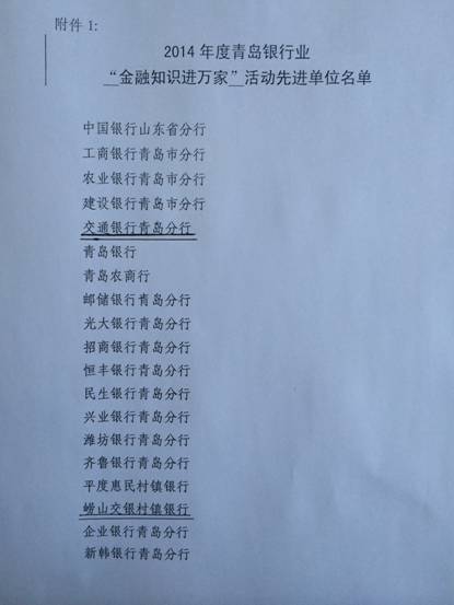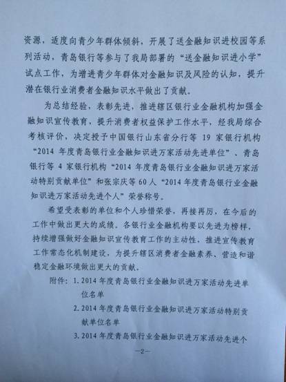2014年9月,青岛银监局组织辖区银行业金融机构开展了为期一个月的“金融知识进万家”银行业金融知识宣传服务月活动。活动结束后,经青岛银监局综合考评,我行被授予“2014年度青岛银行业金融知识进万家活动先进单位”荣誉称号,我行业务发展部马睿、林森被授予“2014年度青岛银行业金融知识进万家活动先进个人”荣誉称号。