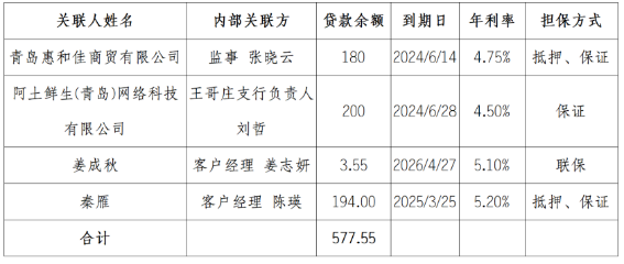 截至2023年末,全行一般关联交易授信贷款余额577.55万元,详情见下表: