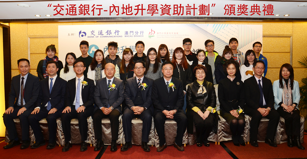 2017年2月10日,“交通銀行-內地升學資助計劃”成功啟動。為支持澳門青年在較佳的學習環境接受高等教育,培養其專業能力及國際視野,交通銀行澳門分行特聯合澳門中華新青年協會推出了“交通銀行-內地升學資助計劃”。 中央人民政府駐澳門特別行政區聯絡辦公室、澳門教育暨青年局、澳門高等教育輔助辦公室等政府機構的領導出席啟動儀式。