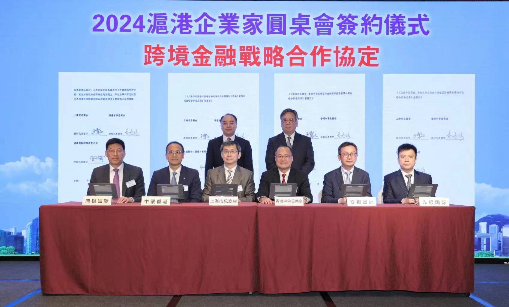 | 4月27日,2024沪港企业家圆桌会在香港举办,会上交银国际与上海市总商会、香港中华总商会签署三方“跨境金融战略合作协议”,进一步拓展“政会银企”合作机制服务圈。交银国际首席执行官谢洁、上海市工商联副主席王煜、香港中华总商会会长蔡冠深代表各方签署协议,上海市委常委、统战部部长陈通,香港特区政府商务及经济发展局局长丘应桦见证签约。 |